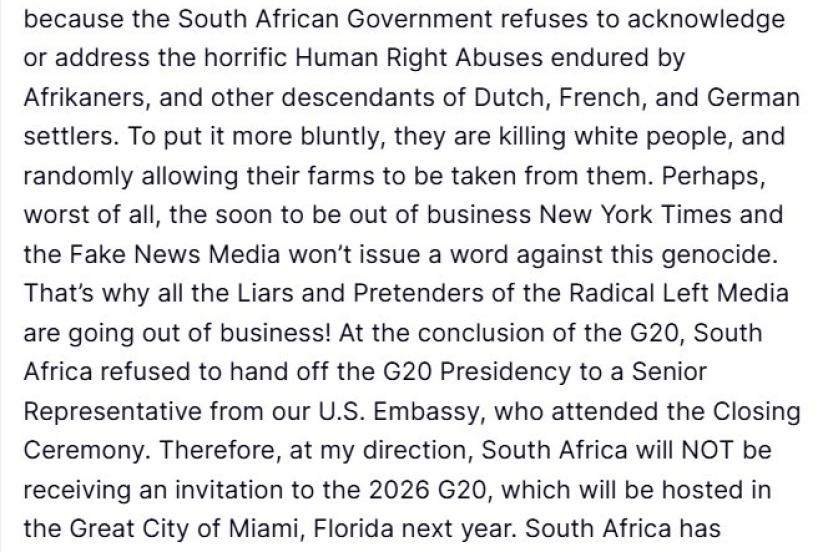 Güney Afrika’nın G20 Zirvesi’nin sonunda yapılan kapanış töreninde ABD Büyükelçiliği’nin kıdemli temsilcisine G20 dönem başkanlığını devretmeyi reddettiğini söyleyen Trump, "Bu nedenle Güney Afrika benim talimatımla gelecek yıl Florida’nın Miami kentinde düzenlenecek olan 2026 G20 Zirvesi’ne davet edilmeyecektir. Güney Afrika, hiçbir yerde üyeliğe layık bir ülke olmadığını dünyaya göstermiştir ve biz de kendilerine yapılan tüm ödemeleri ve yardımları derhal durduracağız" açıklamasında bulundu.