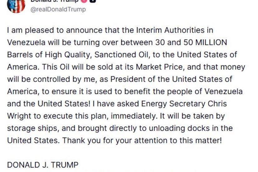 ABD Başkanı Donald Trump, Venezuela’daki geçici yönetimin yaptırım altındaki 30 ila 50 milyon varil arasında yüksel kaliteli ...