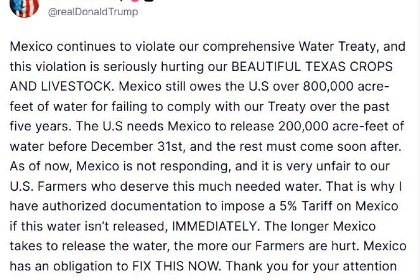 ABD Başkanı Donald Trump, Meksika’nın iki ülke arasındaki su anlaşmasını ihlal ettiğini ve ülkesinin ihtiyaç duyduğu miktarda suyu serbest bırakmadığını belirterek, "Söz konusu su derhal serbest bırakılmadığı takdirde Meksika’ya yüzde 5 gümrük vergisi uygulanmasını öngören belgeleri onayladım" açıklamasında bulundu.
