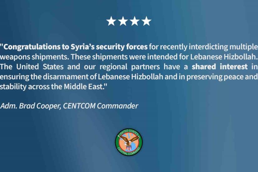 ABD Merkez Kuvvetleri Komutanlığı (CENTCOM) Komutanı Amiral Brad Cooper, "Suriye güvenlik güçlerini, son dönemde birden fazla silah sevkiyatını engelledikleri için tebrik ediyoruz. Bu sevkiyatlar Hizbullah’a ulaşacaktı" dedi.