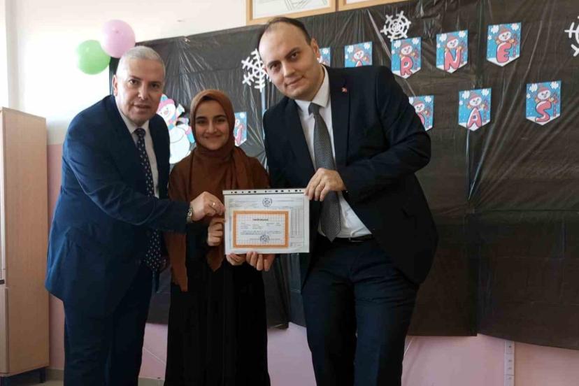 Kaymakam İşçimen öğrencilerin karnelerini dağıtarak hatıra fotoğrafı çektirdi.