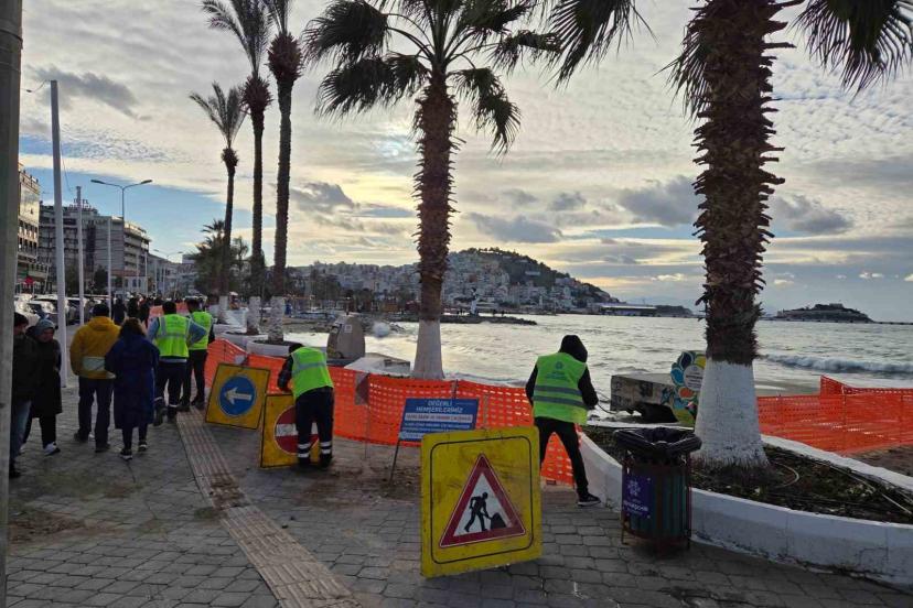 Kuşadası Atatürk Bulvarı sahil şeridinde, kuvvetli dalgalar ve olumsuz hava şartlarının ardından oluşan hasarların giderilmesi amacıyla çalışma başlatıldı.