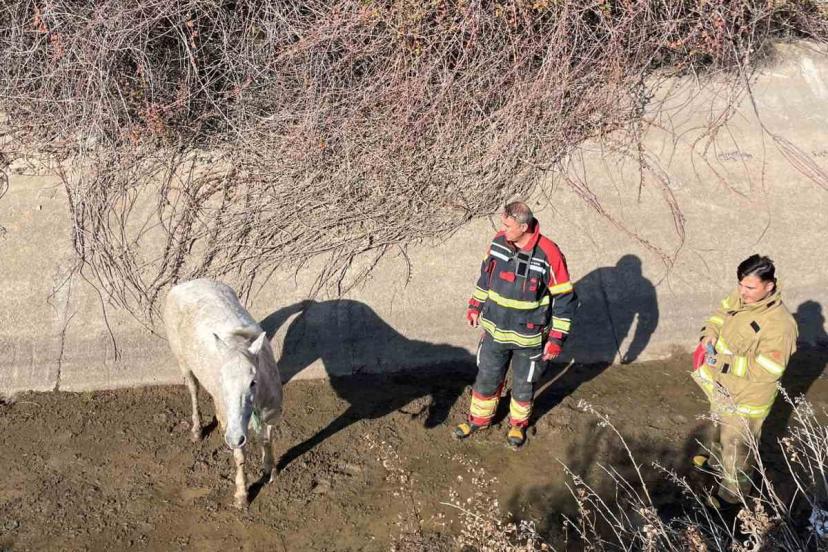 Balıkesir’in Ayvalık ilçesinde su kanalına düşen atı itfaiye ekipleri kurtardı.