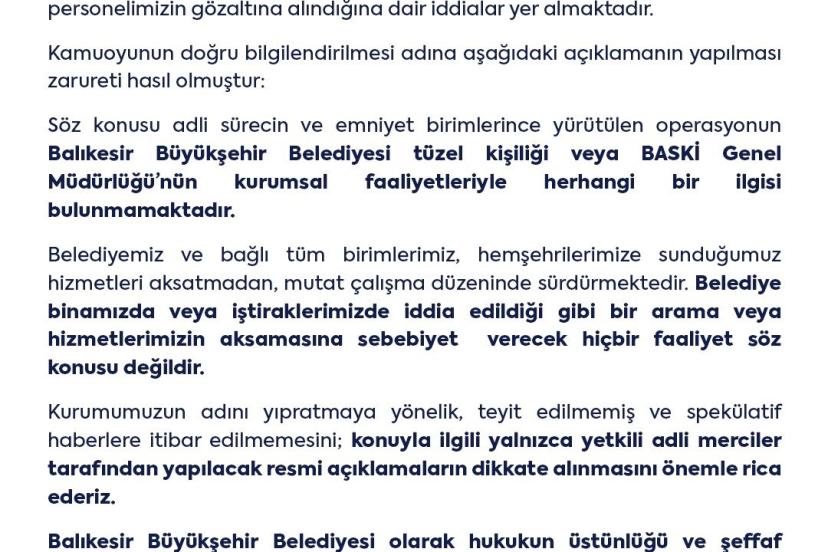 Operasyon ardından Balıkesir Büyükşehir Belediyesi’nden yazılı açıklama yapıldı. Açıklamada, "Bazı basın yayın organlarında ve sosyal medya mecralarında, Balıkesir Büyükşehir Belediyemiz ve iştirakimiz olan BASKİ Genel Müdürlüğü’ne yönelik bir operasyon gerçekleştirildiğine ve personelimizin gözaltına alındığına dair iddialar yer almaktadır. Söz konusu adli sürecin ve emniyet birimlerince yürütülen operasyonun Balıkesir Büyükşehir Belediyesi tüzel kişiliği veya BASKİ Genel Müdürlüğü’nün kurumsal faaliyetleriyle herhangi bir ilgisi bulunmamaktadır. Belediyemiz ve bağlı tüm birimlerimiz, hemşehrilerimize sunduğumuz hizmetleri aksatmadan, mutat çalışma düzeninde sürdürmektedir. Belediye binamızda veya iştiraklerimizde iddia edildiği gibi bir arama veya hizmetlerimizin aksamasına sebebiyet verecek hiçbir faaliyet söz konusu değildir. Kurumumuzun adını yıpratmaya yönelik, teyit edilmemiş ve spekülatif haberlere itibar edilmemesini; konuyla ilgili yalnızca yetkili adli merciler tarafından yapılacak resmi açıklamaların dikkate alınmasını önemle rica ederiz. Balıkesir Büyükşehir Belediyesi olarak hukukun üstünlüğü ve şeffaf yönetim anlayışımızla görevimizin başında olduğumuzu kamuoyunun bilgisine saygıyla sunarız" denildi.