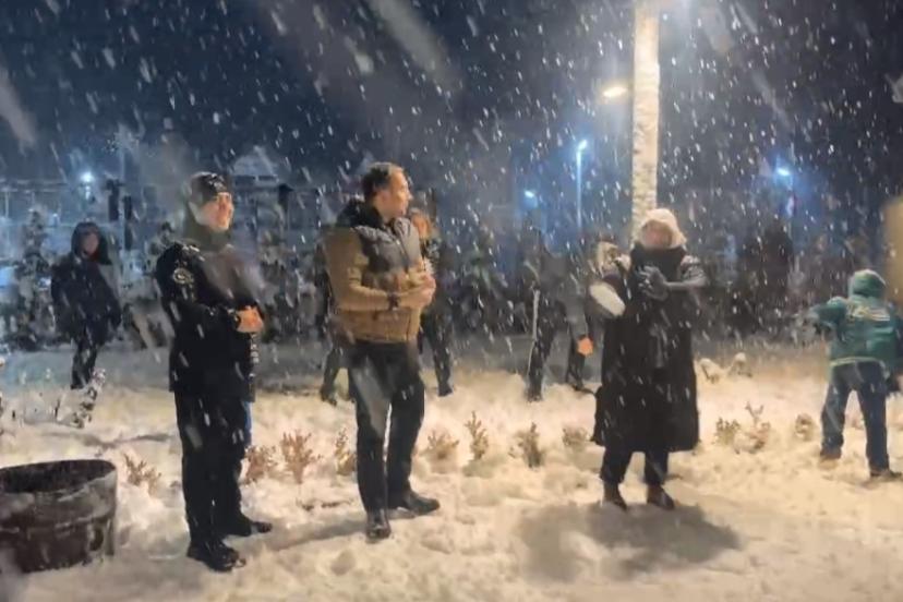 Bartın’ın Ulus ilçesinde etkili olan kar yağışı nedeniyle İlçe Kaymakamı Fırat Kadiroğlu, kurum müdürleri, hakimler ve savcıların da aralarında bulunduğu ilçe protokolü, meydanda vatandaşlarla buluşarak kar topu oynadı. Akşam geç saatlere kadar yoğun kar yağışının keyfini süren protokol ve vatandaşlar, ateşin etrafında ısınarak, halay da çekti.