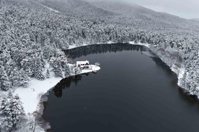 Bolu’nun doğa harikası Gölcük Tabiat Parkı, kar yağışının ardından beyaz gelinliğini giydi.
