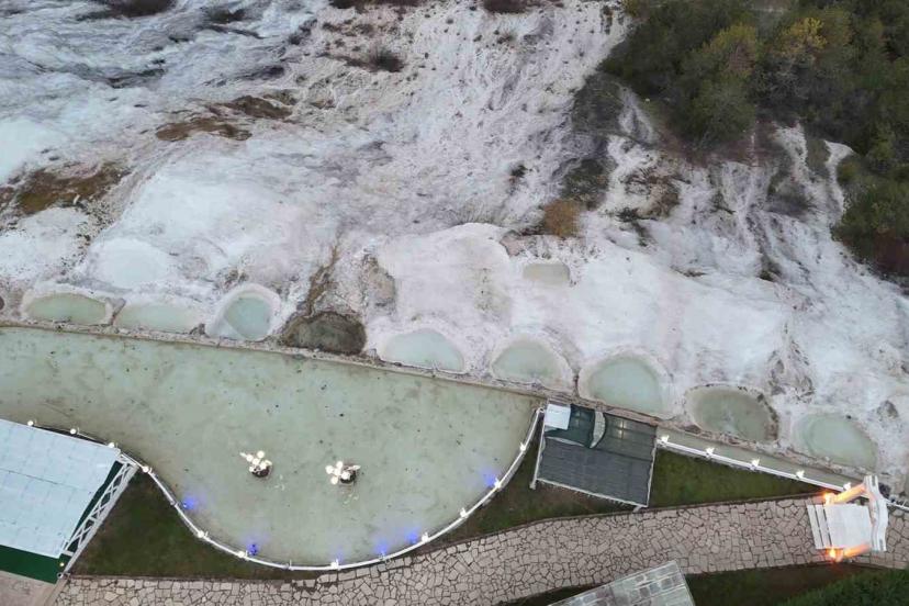 Yeşil çam ormanlarının arasındaki beyaz dokusuyla güzel manzaralar oluşturan travertenler, dron ile havadan görüntülendi.