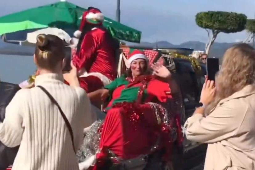 Etkinliğe ait görüntülerde, kırmızı 'Noel Baba' kostümleri giymiş şahısların yeşil ve kırmızı süslemelerle donatılmış bir Fethiye Belediyesi'ne ait zabıta aracı görüldü.