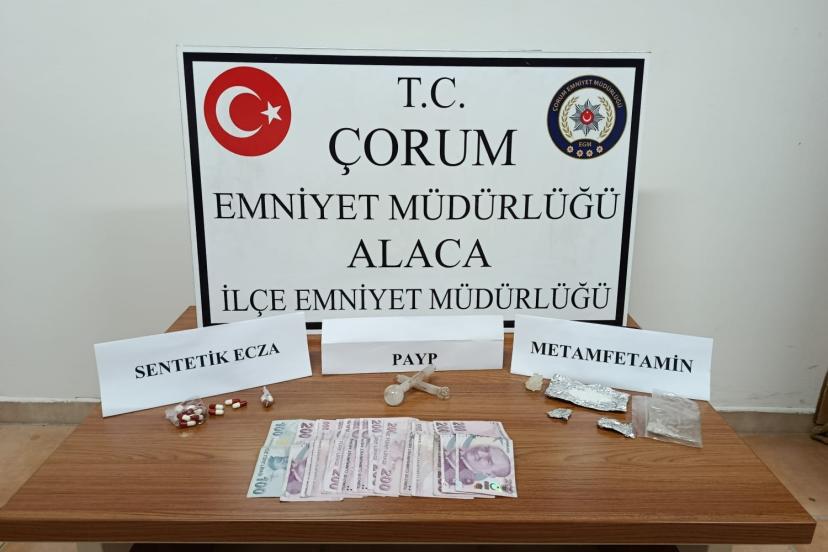 Edinilen bilgiye göre, Alaca İlçe Emniyet Müdürlüğü Asayiş Büro Amirliği ekipleri, yılbaşı tedbirleri kapsamında ilçe genelinde "huzur ve güven" uygulamalarını sıklaştırdı. Bu çerçevede gerçekleştirilen uygulamalarda şüphe üzerine durdurulan iki ayrı araçta detaylı arama yapıldı. İki araçta yapılan aramalarda 18.68 gram metamfetamin, uyuşturucu madde içiminde kullanılan 2 adet düzenek ve 20 adet sentetik ecza hapı ele geçirildi. Olayla bağlantılı olduğu belirlenen E.B., Y.K., Y.H. ve H.B.’yi gözaltına aldı. Sağlık kontrolünden geçirilen 4 şüpheli, ifadeleri alınmak üzere İlçe Emniyet Müdürlüğü’ne götürüldü.