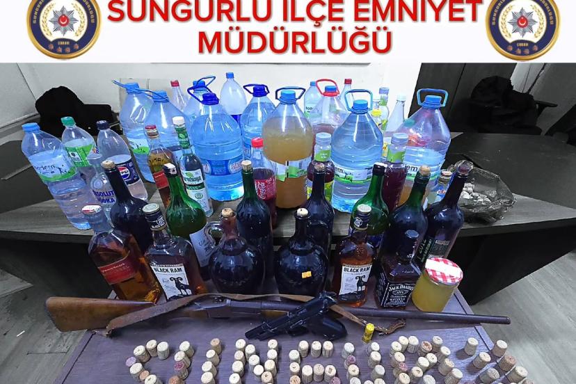 Edinilen bilgiye göre, Sungurlu İlçe Emniyet Müdürlüğü ekipleri, suç ve suçlularla mücadele kapsamında Cumhuriyet Başsavcılığı koordinesinde çalışma başlattı. Yılbaşı kutlamalarını fırsat bilerek piyasaya sahte alkol sürmeye çalışan şahıslara yönelik 30 ve 31 Aralık tarihlerinde operasyon düzenlendi. Belirlenen 4 ayrı adrese yapılan baskın ve aramalarda, toplam 62,5 litre kaçak alkol, alkol üretiminde kullanılan çeşitli malzemeler, 1 adet ruhsatsız tüfek ve 1 adet tabanca ele geçirildi. Operasyon kapsamında gözaltına alınan 3 şüphelinin emniyetteki işlemlerinin devam ettiği, işlemlerinin tamamlanmasının ardından adliyeye sevk edileceği öğrenildi.