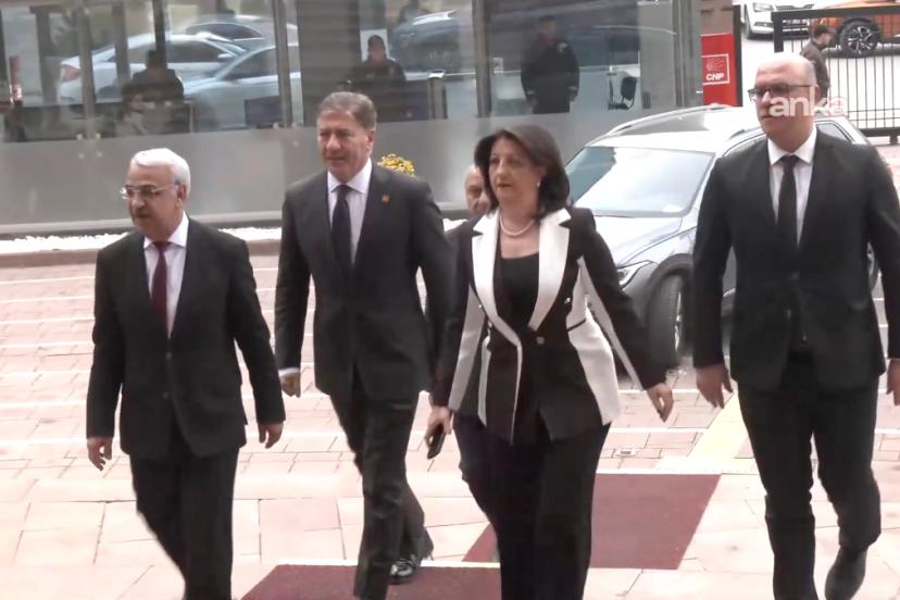 Heyet üyeleri Pervin Buldan, Mithat Sancar ve Özgür Faik Erol, saat 12.00'de CHP Genel Merkezi'ne gelerek Genel Başkan Özgür Özel ile görüşmeye başladı.