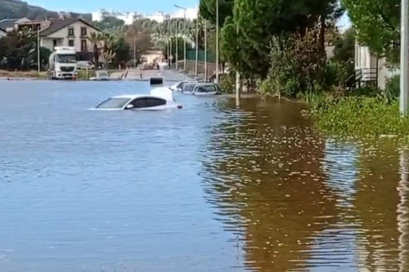 İzmir genelinde sabah saatlerinde etkisini artıran sağanak yağış sebebiyle Dikili ilçesinde yollar göle döndü, park halindeki bazı araçlar suya gömüldü.