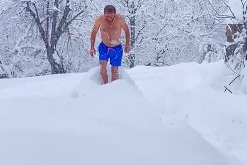 Eksi 10 dereceyi aldırmadan şortuyla karda yüzdü