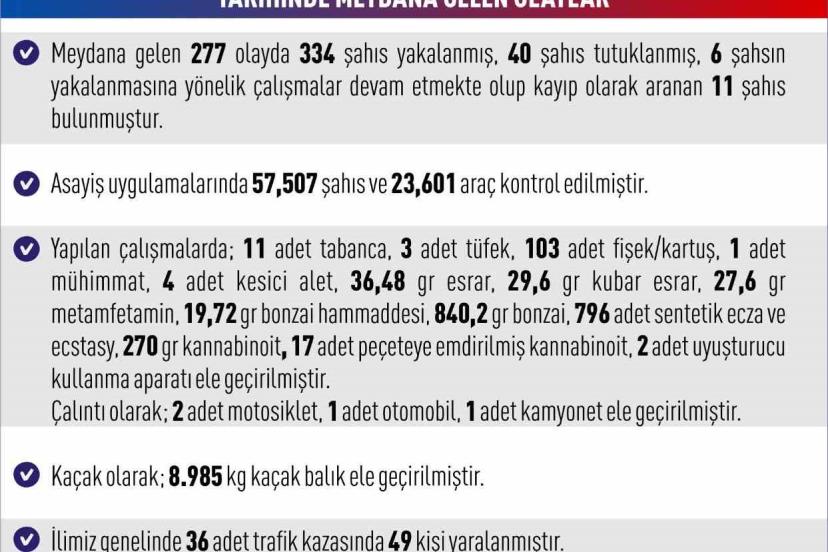 Yapılan çalışmalarda; 11 adet tabanca, 3 adet tüfek, 103 adet fişek/kartuş, 1 adet mühimmat, 4 adet kesici alet, 36,48 gram esrar, 29,6 gram kubar esrar, 27,6 gram metamfetamin, 19,72 gram bonzai hammaddesi, 840,2 gram bonzai, 796 adet sentetik ecza ve ecstasy, 270 gram kannabinoit, 17 adet peçeteye emdirilmiş kannabinoit, 2 adet uyuşturucu kullanma aparatı ele geçirilmiştir. Çalıntı olarak; 2 adet motosiklet, 1 adet otomobil ve 1 adet kamyonetin, kaçak olarak ise 8 bin 985 kilo kaçak balık ele geçirildiği aktarıldı.