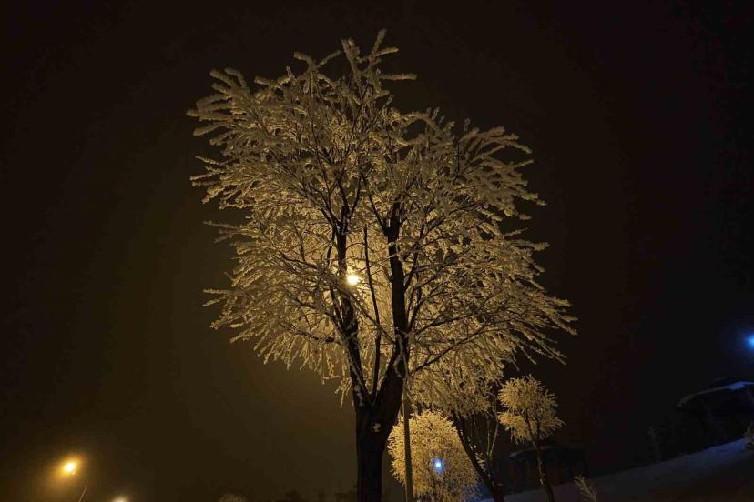 Elazığ’da etkili olan sis ve donla birlikte ağaçlar kırağı tuttu.