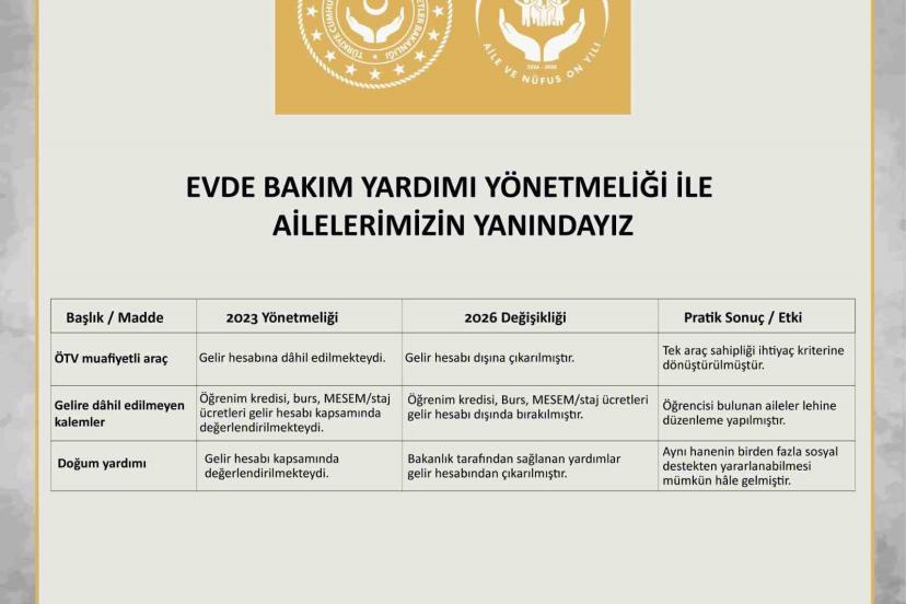 Aile ve Sosyal Hizmetler Bakanlığı ve Maliye Bakanlığınca ‘Evde Bakım Yardımı Yönetmeliği’nde yapılan değişiklikle, hane geli...