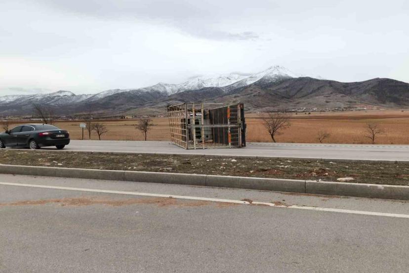 Karaman’da fırtınanın etkisiyle devrilen kamyonetin römorkunun karşı şeride fırladığı anlar cep telefonu kamerasına yansıdı.
