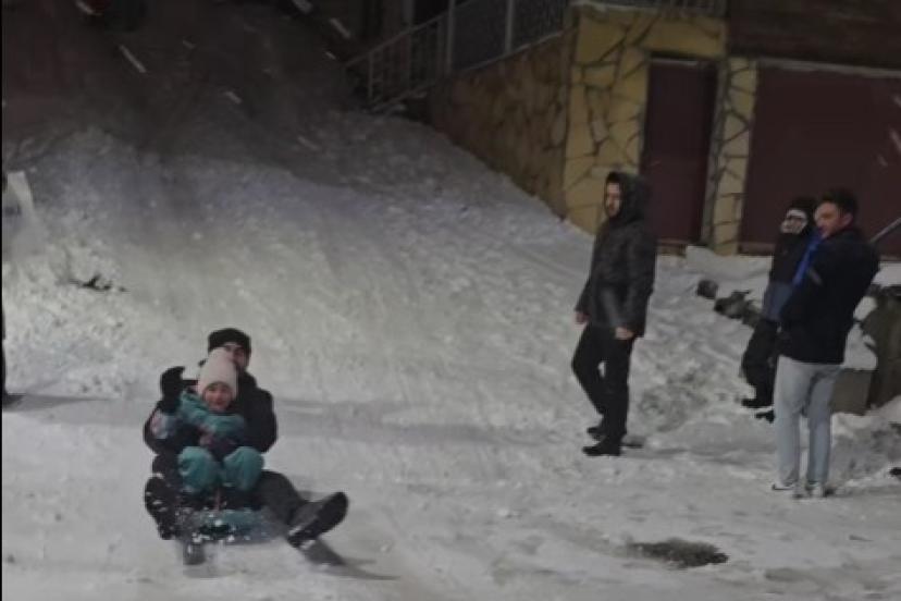 Kulakkaya Yaylasında büyüklü küçüklü vatandaşlar kayarak eğlenirken, gençler kar üstünde horon teptiler.