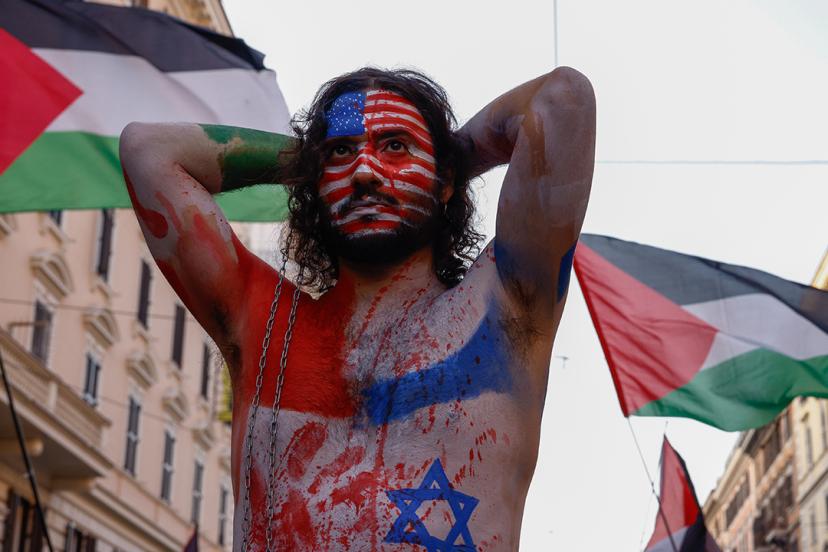 Bir göstericinin, yüzünü ve bedenini ABD, İsrail ve İtalya bayrağı şeklinde boyayıp üzerinde kanlı el izleri bulunması dikkati çekti.