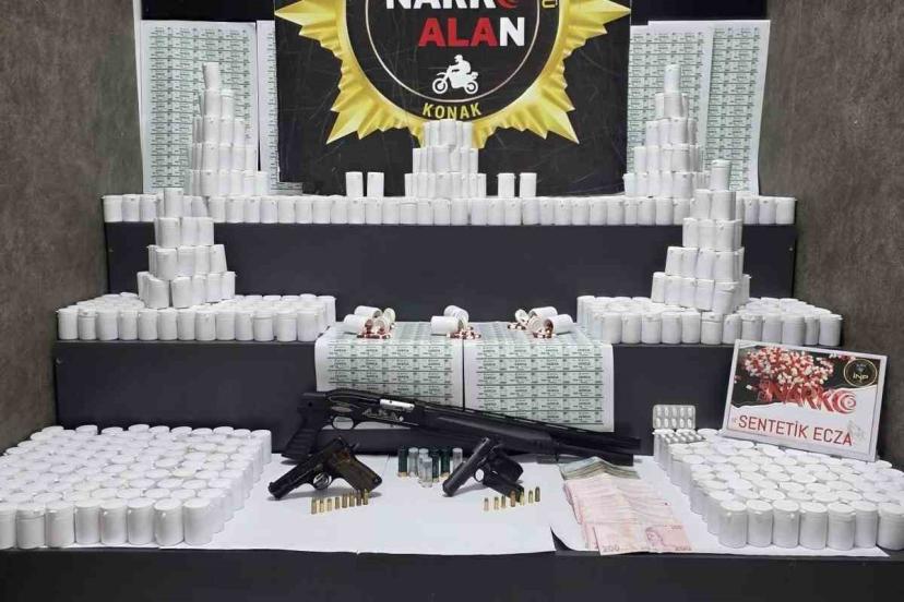Edinilen bilgiye göre, İl Emniyet Müdürlüğü Konak İlçe Emniyet Müdürlüğüne bağlı Narkotik Suçlarla Mücadele (NARKO ALAN) ekipleri, uyuşturucu madde ticaretinin önlenmesine yönelik çalışmalarını sürdürüyor. Ekipler, 6 Ocak günü Hilal Mahallesi’nde uyuşturucu madde depolandığı ve ticaretinin yapıldığı belirlenen adreslere operasyon düzenledi. Adreslerde yapılan aramalarda 108 bin 472 adet sentetik ecza, 1 adet pompalı tüfek ve tüfeğe ait 9 adet dolu kartuş, 2 adet ruhsatsız tabanca, şarjörler ve çok sayıda fişek ile suçtan elde edildiği değerlendirilen 75 bin 100 TL nakit para ele geçirildi. Operasyonda N.P. (28), F.B. (29) ve N.K. (41) isimli 3 şüpheli yakalanarak gözaltına alındı. Yapılan sorgulamada şüphelilerden birinin kesinleşmiş hapis cezası ile arandığı tespit edildi. Şüpheliler hakkında adli işlem başlatıldığı öğrenildi.