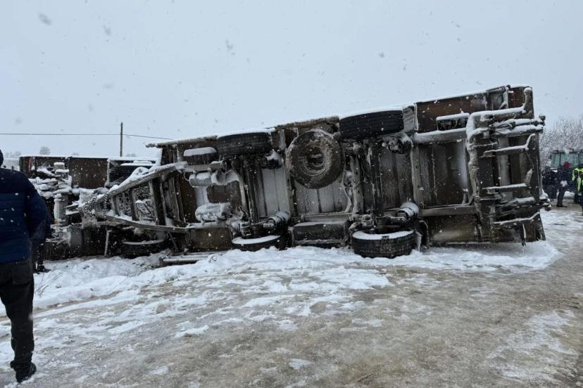 Kastamonu’da kar yağışı sebebiyle devrilen tırın sürücüsü yara almadan kurtuldu.