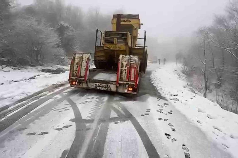 Zonguldak’tan Bartın’daki Çöp Depolama ve Geri Dönüşüm Tesisi’ne iş makinesi taşıyan bir tır, yoğun kar yağışı ve buzlanma nedeniyle kayarak yolu ulaşıma kapattı. Bartın -Amasra eski kara yolu Kazpınarı köyü mevkisinde meydana gelen olayın ardından bölgeye jandarma ve karla mücadele ekipleri yönlendirildi. Yaklaşık 2.5 saat trafiğe kapatılan yoldaki tırı kurtarmak için iş makineleri ile yoğun bir çalışma başlatıldı. Jandarma ekipleri tarafından ise alınan güvenlik tedbirleri ile trafik tünel yoluna yönlendirildi. Kar küreme ve tuzlama çalışmalarının tamamlanmasının ardından üstünde iş makinesi bulunan tır, tesise ulaştırıldı.