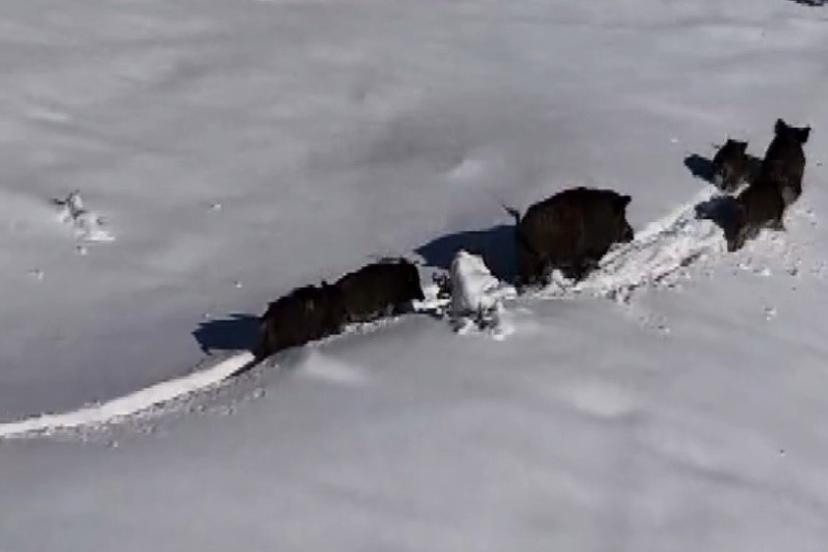 Karlı arazide ilerleyen domuz sürüsü havadan görüntülendi