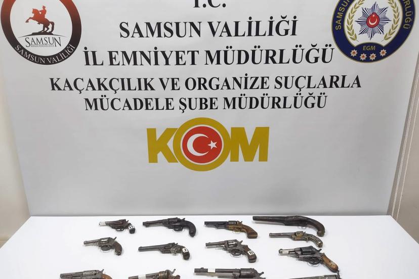 Samsun Emniyet Müdürlüğü Kaçakçılık ve Organize Suçlarla Mücadele (KOM) Şube Müdürlüğü ekiplerince yapılan incelemelerde, hakkında daha önce adli işlem yapılan bir şahsa ait 12 tabancanın, Tescile Tabi Kültür Varlığı Belgesi düzenlenerek Müze Müdürlüğü tarafından kendisine teslim edildiği, ancak şahsın yasal süresi içerisinde ruhsat başvurusu yapmadığı ve söz konusu tabancaları görevlilere kayıp olarak bildirdiği belirlendi.