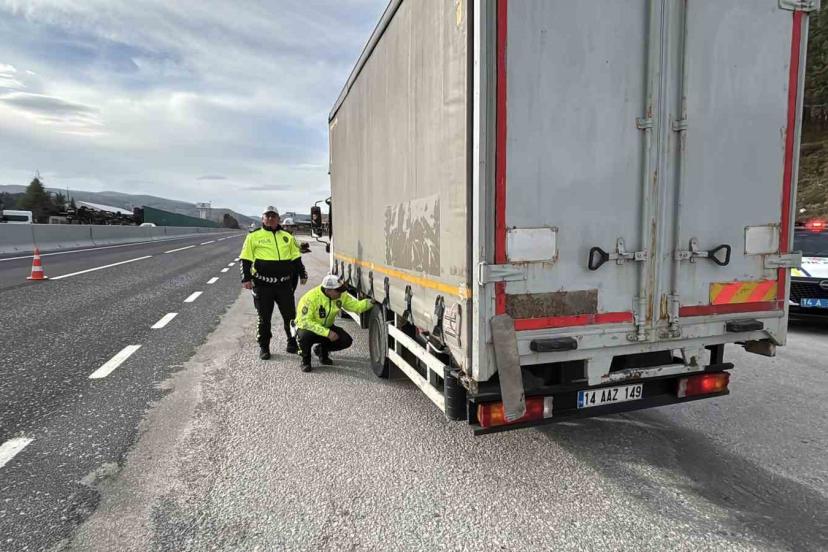 Türkiye’nin en önemli geçiş noktalarından biri olan Bolu Dağı geçişinde polis ekipleri, kış lastiği uygulaması yaptı.
