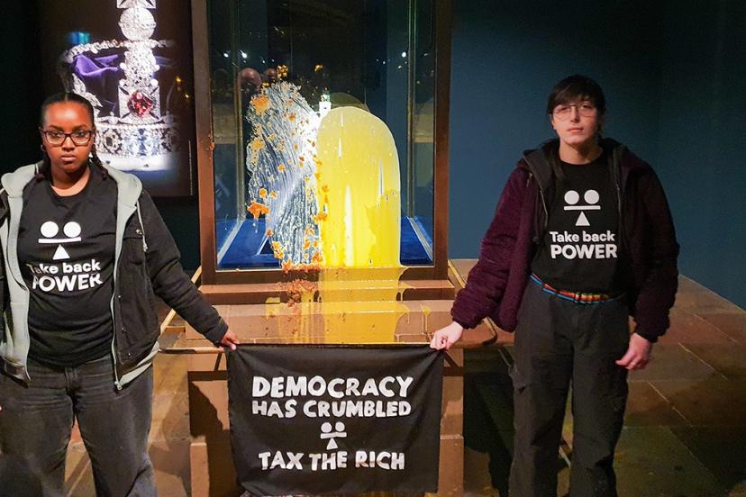 Grup üyeleri tacın sergilendiği Londra Kulesi'ndeki salona girerek cam muhafazaya muhallebi attı. Aşırı zenginlerden daha fazla vergi alınmasını ve "Halk Kamarası" adlı bir halk meclisi kurulmasını savunan grubun aktivistleri, tacın cam muhafazasına İngiltere'nin ünlü tatlısı apple crumble and custard sürdü.