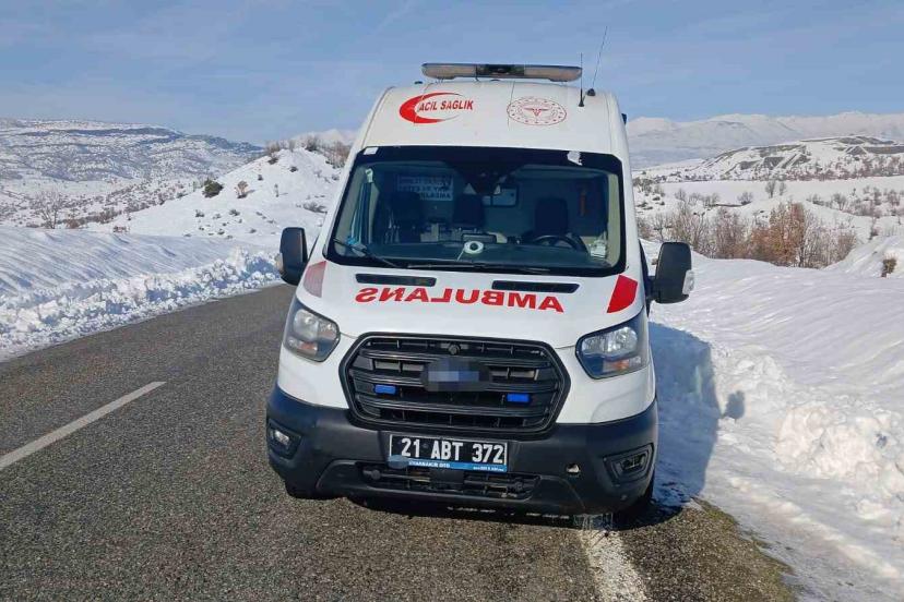 Diyarbakır’da kar ve soğuk havanın etkili olduğu Kulp ilçesinde bir ambulans arıza nedeniyle yol kenarında bekliyor.