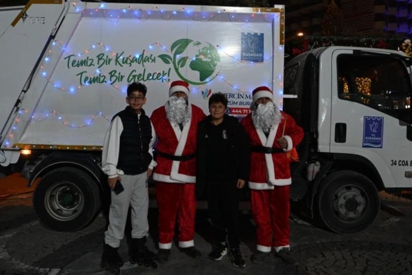 Kuşadası Belediyesi, çöp toplayıcılara Noel Baba kostümü giydirdi
