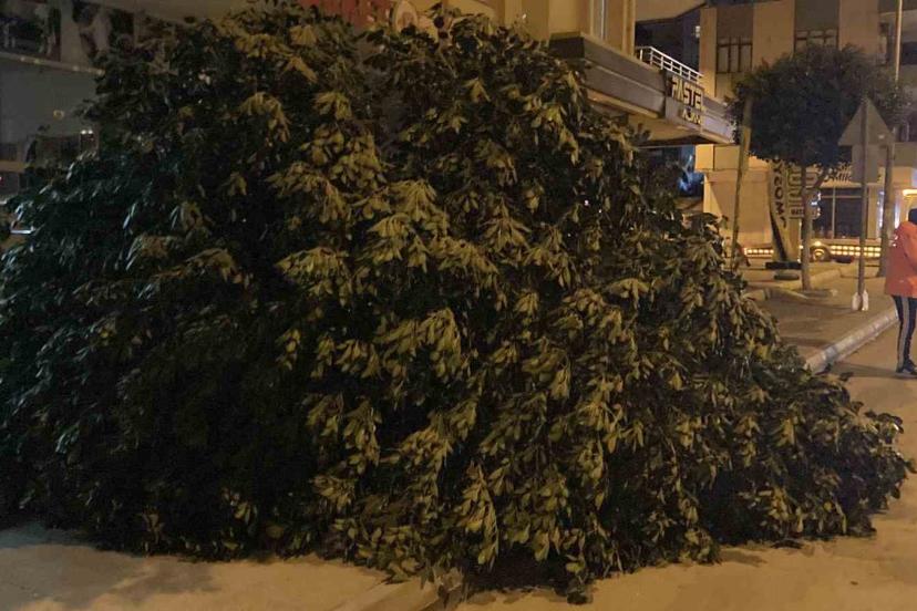 Mersin’in Erdemli ilçesinde şiddetli rüzgar bir ağacı yerinden söküp devirdi, başka bir ağacı da ortadan kırdı.