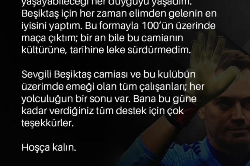 "15 Ağustos 2021. Beşiktaş’a imza attığım ilk gün... Yüzlerce antrenman, onlarca maç, galibiyetler, mağlubiyetler, sakatlıklar, geri dönüşler, şanslar, şanssızlıklar... Bir kalecinin yaşayabileceği her duyguyu yaşadım. Beşiktaş için her zaman elimden gelenin en iyisini yaptım. Bu formayla 100’ün üzerinde maça çıktım; bir an bile bu camianın kültürüne, tarihine leke sürdürmedim.