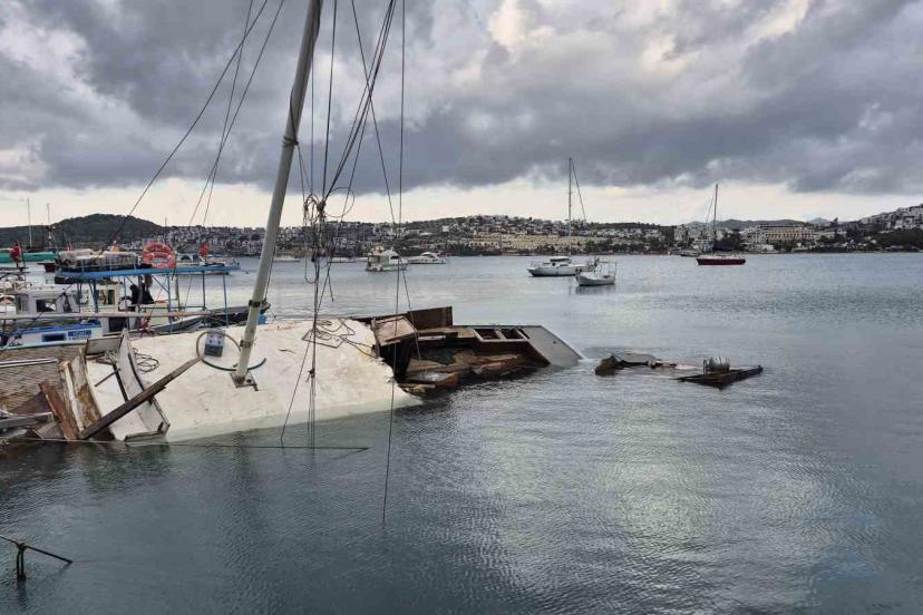 Muğla’nın Bodrum ilçesinde etkili olan kuvvetli rüzgarda yelkenli bir tekne su alarak yarıya kadar battı.