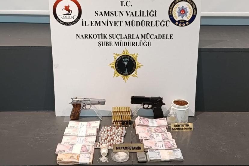 İl Emniyet Müdürlüğü Narkotik Suçlarla Mücadele Şube Müdürlüğü ekiplerince İlkadım, Çarşamba ve Tekkeköy ilçelerinde eş zamanlı operasyonlar gerçekleştirildi. Operasyonlarda 7 şüphelinin üst, araç ve ikametlerinde yapılan aramalarda 5 bin 541 adet sentetik ecza, 205,06 gram bonzai (sentetik kannabinoid), 33 mililitre likit esrar, 16,83 gram metamfetamin, 3,12 gram esrar, 21 adet ecstasy, 0,72 gram kokain, 3 adet uyuşturucu madde kullanım aparatı ve 1 adet hassas terazi ele geçirildi. Ayrıca uyuşturucu ticaretinden elde edildiği değerlendirilen 160 bin 200 TL ile 2 ruhsatsız tabanca, 165 adet tabanca fişeği ve 1 pompalı tüfek bulundu. Yakalanan 7 şüpheli hakkında adli işlem başlatıldı.