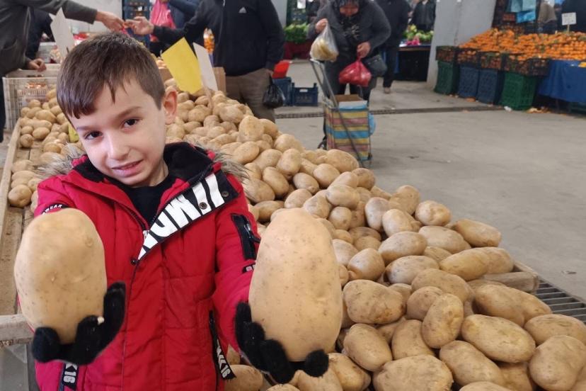 Dev patatesler, çocukların da ilgisini çekti. Anne ve babasından izin alarak tezgaha yaklaşan küçük Yağız Sarıkaya, iki dev patatesi eline alarak fotoğraf çektirmeyi ihmal etmedi.