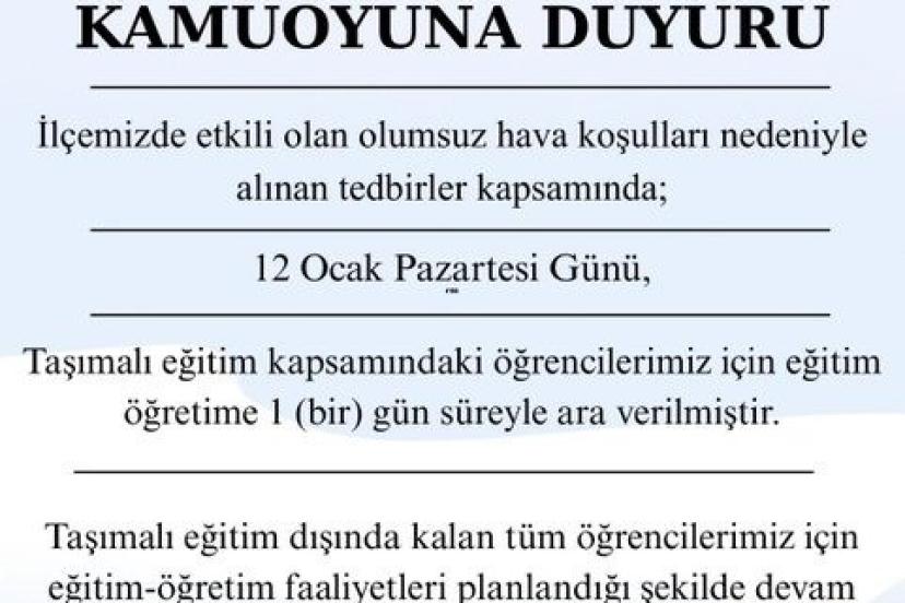 Açıklamada, taşımalı eğitim dışında kalan öğrenciler için eğitim-öğretim faaliyetlerinin planlandığı şekilde devam edeceği belirtildi.