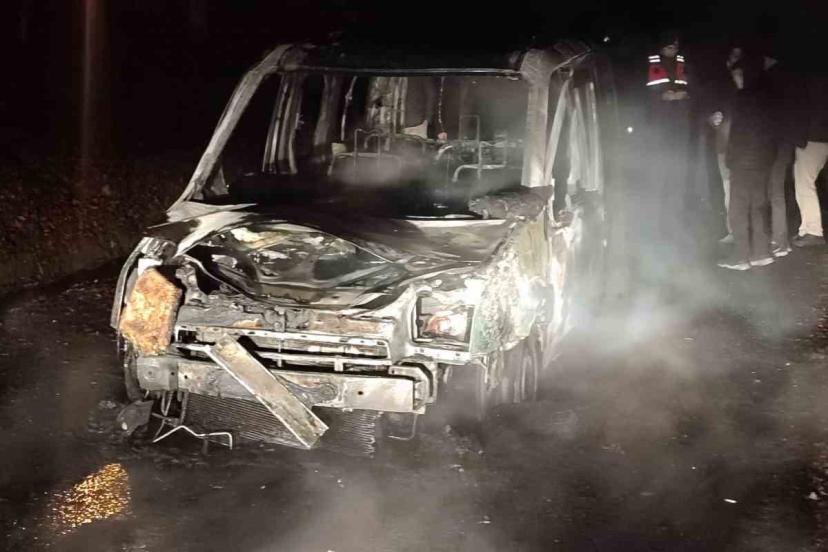 Karabük’ün Yenice ilçesinde seyir halindeyken alev alan hafif ticari araç tamamen yanarak kullanılmaz hale geldi.