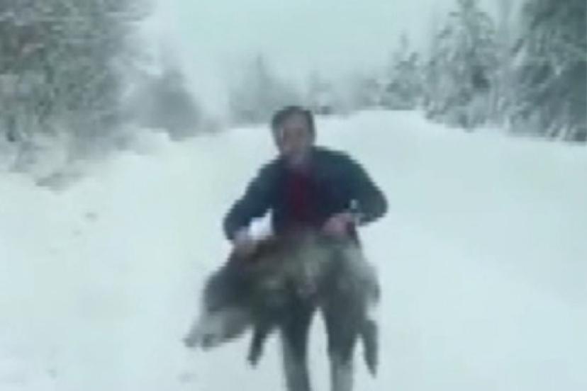 Sinop’un Erfelek ilçesinde karlı yolda ilerleyen bir araç yaban domuzu sürüsü ile karşı karşıya geldi. Araçtan inip yaban domuzunu kovalayan bir vatandaş hayvanı eliyle yakalayıp geri bıraktı. O anlar telefon kamerasına yansıdı.