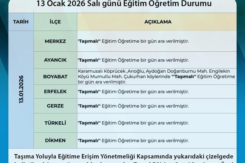 Valilikten yapılan açıklamada, 13 Ocak 2026 Salı günü Merkez ilçe ile Ayancık, Erfelek, Dikmen, Gerze ve Türkeli ilçelerinde taşımalı eğitime bir gün süreyle ara verildiği bildirildi. Boyabat ilçesinin ise bazı bölgelerinde taşımalı eğitime kısmi olarak ara verildiği kaydedildi.