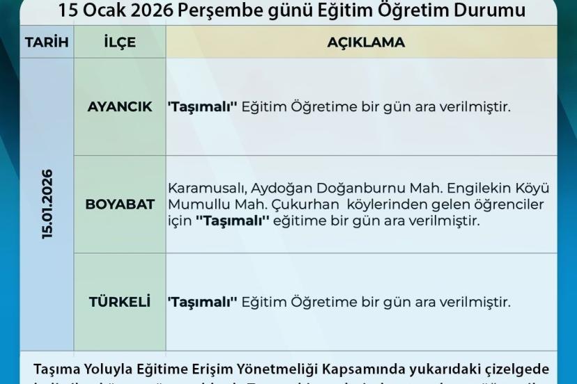 Sinop Valiliği tarafından yapılan açıklamada, olumsuzlukların önüne geçilmesi amacıyla 15 Ocak Perşembe günü Ayancık ve Türkeli ilçelerinde taşımalı eğitimin bir gün süreyle durdurulduğu bildirildi.
