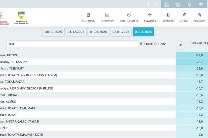 Tokat’ta etkili olan dondurucu soğuklar, kentte son 100 yılın ocak ayına ait en düşük sıcaklık rekorunun kırılmasına neden oldu. Daha önce Tokat genelinde ocak ayı için ölçülen en düşük sıcaklık, 20 Ocak 1972 tarihinde -23,4 derece olarak kayıtlara geçmişti. Bu rekor, Artova ilçesinde ölçülen -29 derece ile geride kaldı. Meteoroloji verilerine göre, Artova’da termometreler gece saatlerinde -29 dereceyi gösterirken, Tokat kent merkezinde ise sıcaklık -18 derece olarak ölçüldü. Aşırı soğuklar hayatı olumsuz etkilerken, kent merkezinden geçen Yeşilırmak’ın yüzeyi buz tuttu. Irmak üzerinde oluşan buz tabakası, soğuk havanın boyutunu gözler önüne serdi. Vatandaşlar, uzun yıllardır bu denli sert bir soğukla karşılaşmadıklarını belirtirken, yetkililer özellikle gece saatlerinde buzlanma ve don olaylarına karşı dikkatli olunması yönünde uyarılarda bulundu.