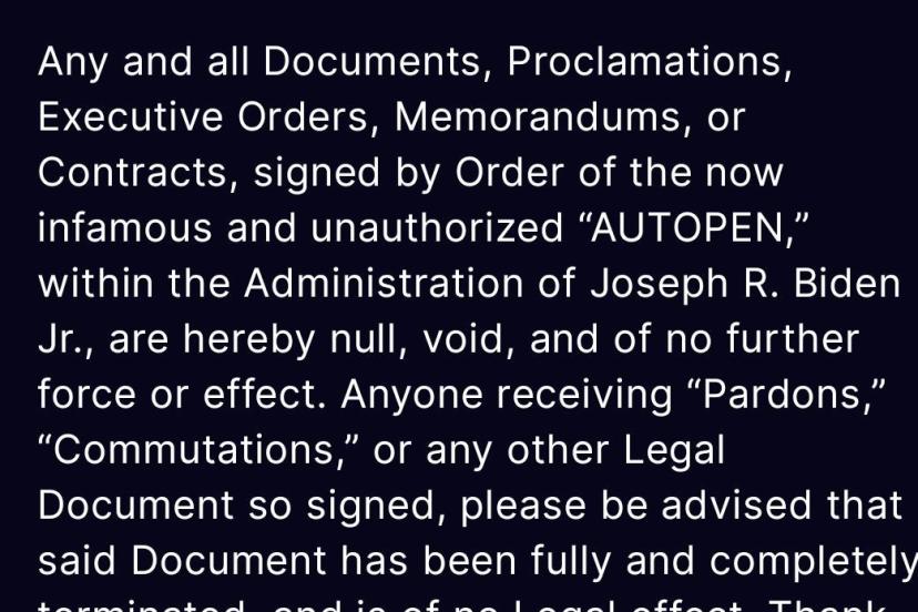 ABD Başkanı Donald Trump, selefi Joe Biden döneminde "Autopen" (imza makinesi) ile imzalanmış tüm belgelerin artık geçersiz olduğunu belirterek, "Af, ceza indirimi veya bu şekilde imzalanmış başka bir belge alan herkes, söz konusu belgenin hiçbir yasal etkisinin olmadığını unutmamalıdır" açıklamasında bulundu.