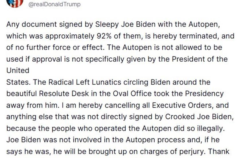 Bu nedenle o dönemde imzalanan tüm resmi belgeleri geçersiz kıldığını söyleyen Trump, "Sahtekar Joe Biden tarafından doğrudan imzalanmamış tüm başkanlık kararnamelerini ve resmi belgeleri iptal ediyorum. Çünkü ‘Autopen’i kullanan kişiler bunu yasadışı bir şekilde yapmıştır" dedi. Biden’ın resmi başkanlık belgelerinin "Autopen" ile imzalandığı sürece dahil olmadığının altını çizen Trump, "Eğer dahil olduğunu söylerse, yalancı şahitlik suçlamasıyla karşı karşıya kalacaktır" uyarısında bulundu.