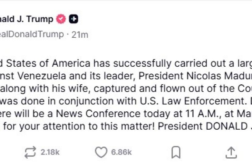 ABD Başkanı Donald Trump sosyal medya hesabından yaptığı paylaşımda, ülkesinin Venezuela’ya saldırı gerçekleştirdiğini doğruladı. Trump paylaşımında, Venezuela Devlet Başkanı Nicolas Maduro’nun ve eşinin ülke dışına çıkarıldığını belirterek, "ABD, Venezuela ve lideri Devlet Başkanı Nicolas Maduro’ya karşı geniş çaplı bir saldırı düzenleyerek Maduro ile eşini yakalamayı ve ülkeden çıkarmayı başardı. Bu operasyon ABD kolluk kuvvetleriyle iş birliği içinde gerçekleştirildi. Ayrıntılar daha sonra paylaşılacak" ifadelerini kullandı. Trump, Türkiye saati ile 19.00’da Florida’daki Mar-a-Lago’da basın toplantısı düzenleneceğini aktardı.