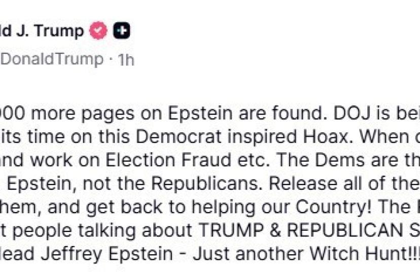 ABD Başkanı Donald Trump, ABD Adalet Bakanlığı’nın tüm zamanını "Epstein" belgelerine harcamak zorunda bırakıldığını ve Epstein ile ilişkisi bulunanların Cumhuriyetçiler değil, Demokratlar olduğunu belirterek, "Hepsinin isimlerini açıklayın, ifşa edin ve gerçekten ülkemize hizmet etmeye geri dönün" çağrısında bulundu.