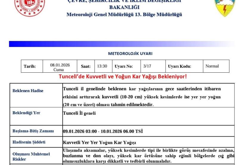 Meteoroloji 13. Bölge Müdürlüğü’nden yapılan uyarıda, "Tunceli il genelinde beklenen kar yağışlarının sabah saatlerinden itibaren etkisini arttırarak kuvvetli (10-20 cm) yüksek kesimlerde ise yer yer yoğun (20 cm ve üzeri) olması tahmin edilmektedir. Ulaşımda aksamalar, yüksek kesimlerde tipi ile birlikte görüş mesafesinde azalma, buzlanma ve don olayı, yüksek kar örtüsüne sahip eğimli bölgelerde çığ gibi olumsuzluklara karşı dikkatli ve tedbirli olunmalıdır" denildi.