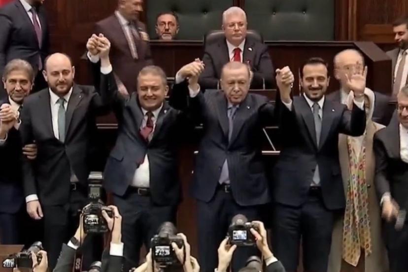 Cumhurbaşkanı Recep Tayyip Erdoğan, grup toplantısındaki konuşmasının ardından AK Parti'ye katılan üç vekilin rozetlerini taktı.