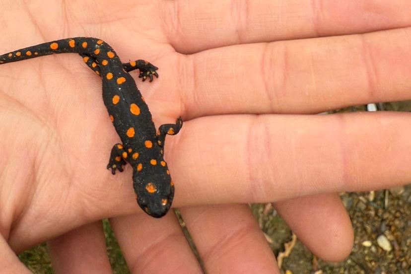 Van’ın Bahçesaray ilçesinde doğa yürüyüşüne çıkan bir grup doğasever, nadir görülen benekli semender (Salamandra infraimmaculata) ile karşılaştı.